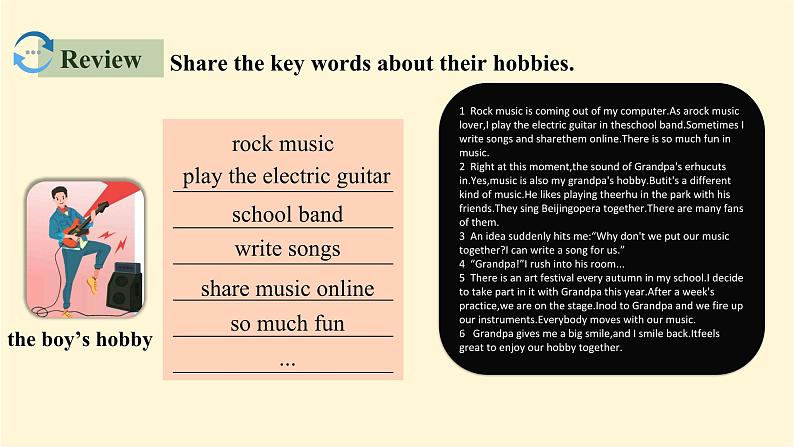 1 Rck music is cming ut f my cmputer.As arck music lver,I play the electric guitar in theschl band.Smetimes I write sngs and sharethem nline.There is s much fun in music.2 Right at this mment,the sund f Grandpa's erhucuts in.Yes,music is als my grandpa's hbby.Butit's a different kind f music.He likes playing theerhu in the park with his friends.They sing Beijingpera tgether.There are many fans f them.3 An idea suddenly hits me:“Why dn't we put ur music tgether?I can write a sng fr us.”4 “Grandpa!”I rush int his There is an art festival every autumn in my schl.I decide t take part in it with Grandpa this year.After a week's practice,we are n the stage.Ind t Grandpa and we fire up ur instruments.Everybdy mves with ur music.6 Grandpa gives me a big smile,and I smile back.Itfeels great t enjy ur hbby tgether.