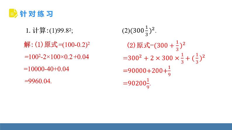 解:(1)原式=(100-0.2)2=1002-2×100×0.2+0.04=10000-40+0.04=9960.04.