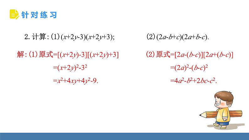 2.计算:(1)(x+2y-3)(x+2y+3); (2)(2a-b+c)(2a+b-c).