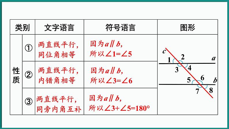 这是一份数学七年级下册第二章 相交线与平行线3 平行线的性质备课ppt课件,共28页。PPT课件主要包含了同位角,内错角,同旁内角,两直线平行,同位角相等,内错角相等,同旁内角互补,平行线的性质,∠1∠2,∠3∠2等内容,欢迎下载使用。