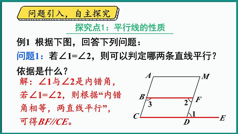 问题1:若∠1=∠2,则可以判定哪两条直线平行?依据是什么?