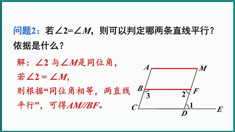 问题2:若∠2=∠M,则可以判定哪两条直线平行?依据是什么?