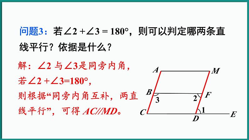 问题3:若∠2 +∠3 = 180°,则可以判定哪两条直线平行?依据是什么?