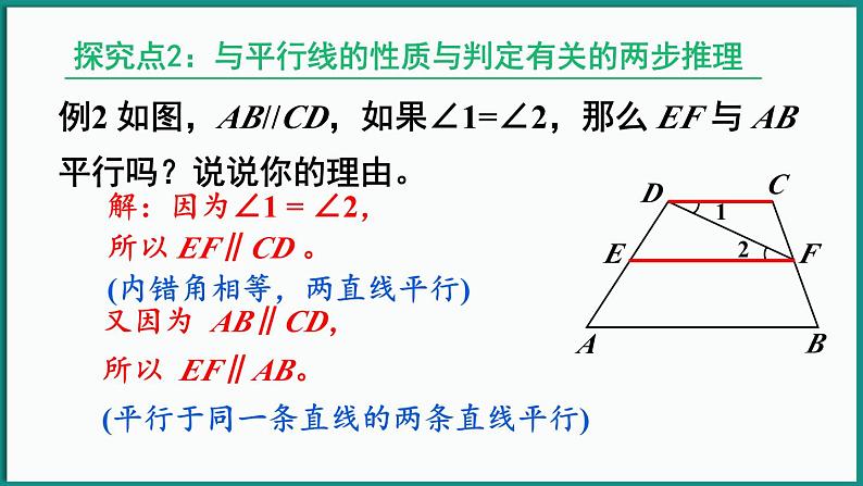 例2 如图,AB//CD,如果∠1=∠2,那么 EF 与 AB 平行吗?说说你的理由。