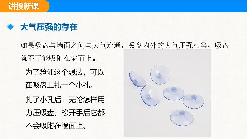 挤压出空气的吸盘能吸附在光滑的墙面上并承载重物。这是因为大气把吸盘压在墙面上。