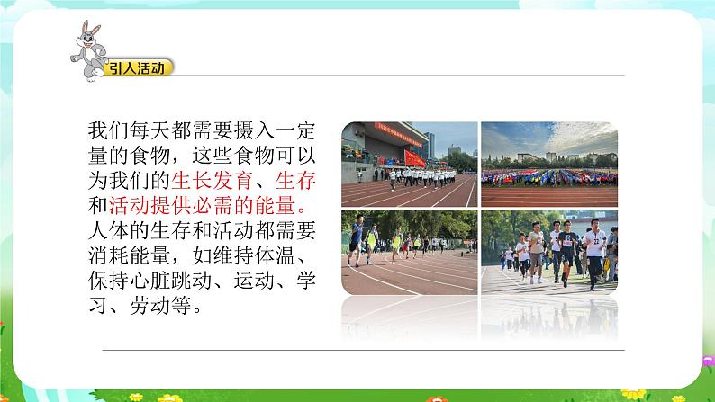 (科学观念)知道食物能够为人体的生长发育、生存和活动提供能量。知道人体的生存和活动,都需要消耗能量。