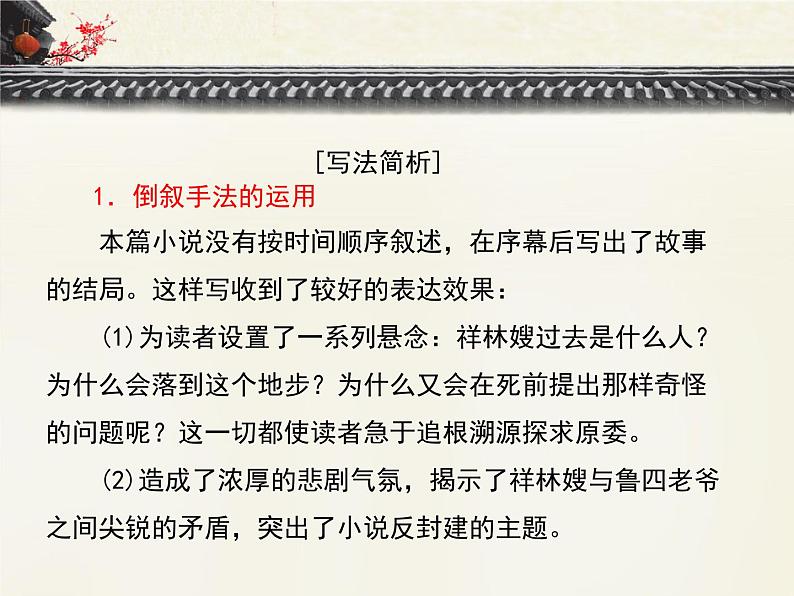 1.倒叙手法的运用 本篇小说没有按时间顺序叙述,在序幕后写出了故事的结局。这样写收到了较好的表达效果: (1)为读者设置了一系列悬念:祥林嫂过去是什么人?为什么会落到这个地步?为什么又会在死前提出那样奇怪的问题呢?这一切都使读者急于追根溯源探求原委。 (2)造成了浓厚的悲剧气氛,揭示了祥林嫂与鲁四老爷之间尖锐的矛盾,突出了小说反封建的主题。
