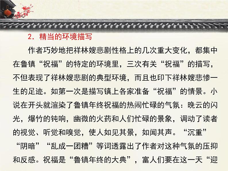 2.精当的环境描写 作者巧妙地把祥林嫂悲剧性格上的几次重大变化,都集中在鲁镇“祝福”的特定的环境里,三次有关“祝福”的描写,不但表现了祥林嫂悲剧的典型环境,而且也印下祥林嫂悲惨一生的足迹。如第一次是描写镇上各家准备“祝福”的情景。小说在开头就渲染了鲁镇年终祝福的热闹忙碌的气氛:晚云的闪光,爆竹的钝响,幽微的火药和人们忙碌的景象,调动了读者的视觉、听觉和嗅觉,使人如见其景,如闻其声。“沉重”“阴暗”“乱成一团糟”等词透露出了作者对这种气氛的压抑和反感。祝福是“鲁镇年终的大典”,富人们要在这一天“迎