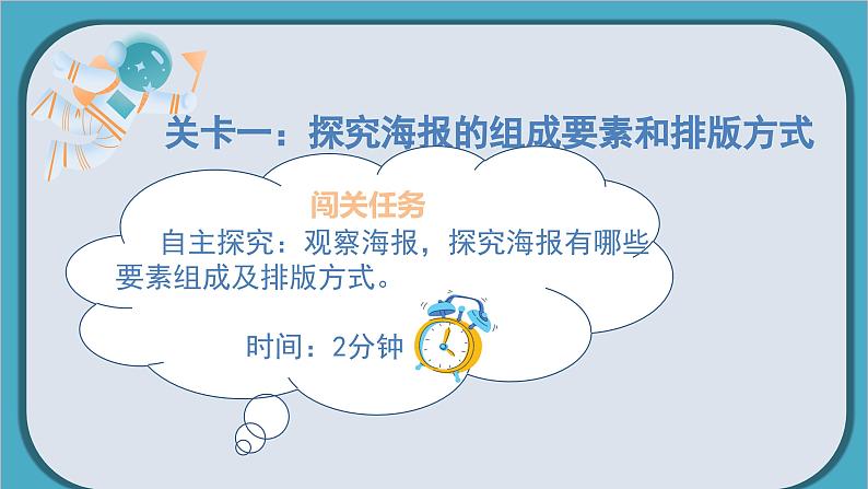 闯关任务 自主探究:观察海报,探究海报有哪些要素组成及排版方式。 时间:2分钟