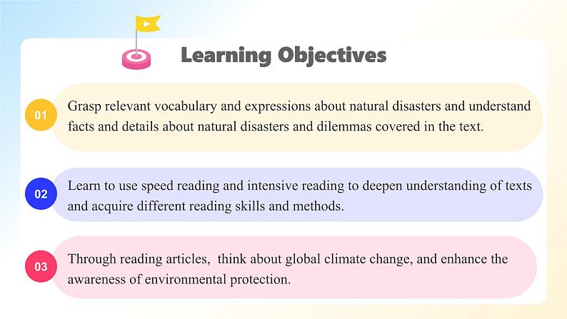 Grasp relevant vcabulary and expressins abut natural disasters and understand facts and details abut natural disasters and dilemmas cvered in the text.
