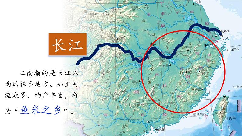 江南指的是长江以南的很多地方。那里河流众多,物产丰富,称为“鱼米之乡”。
