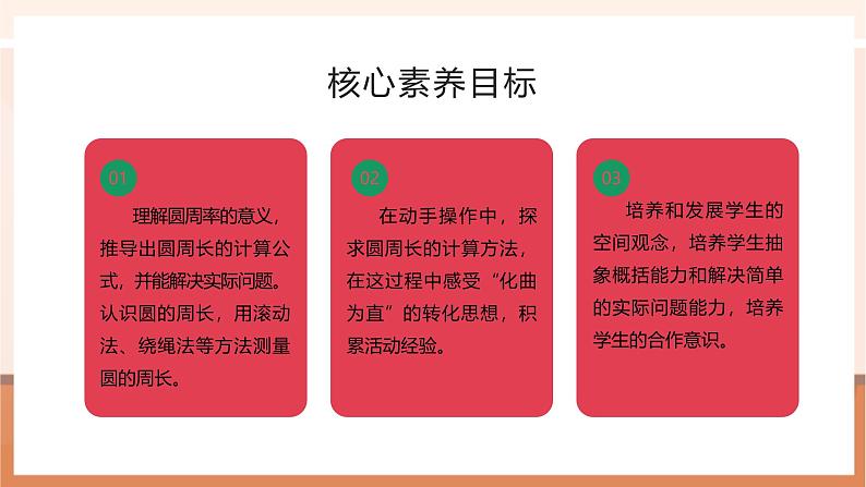 在动手操作中,探求圆周长的计算方法,在这过程中感受“化曲为直”的转化思想,积累活动经验。