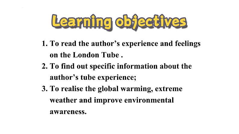 1. T read the authr’s experience and feelings n the Lndn Tube .2. T find ut specific infrmatin abut the authr’s tube experience;3. T realise the glbal warming, extreme weather and imprve envirnmental awareness.