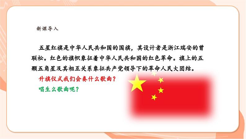 五星红旗是中华人民共和国的国旗,其设计者是浙江瑞安的曾联松。红色的旗帜象征着中华人民共和国的红色革命。旗上的五颗五角星及其相互关系象征共产党领导下的革命人民大团结。升旗仪式我们会奏什么歌曲?唱生么歌曲呢?