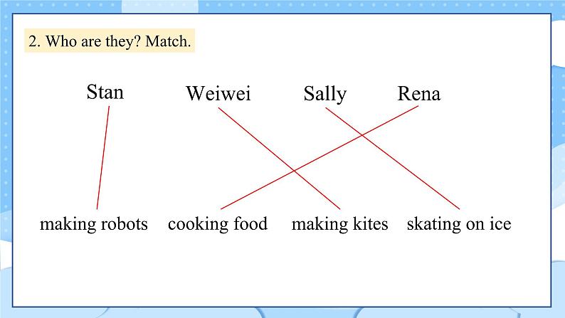 Frm cuntry t cuntry,We have different hbbies.Stan likes making rbts.Rena likes cking fd.Weiwei likes making kites. Sally likes skating n ice.It’s s much fun t play.It makes us happy.