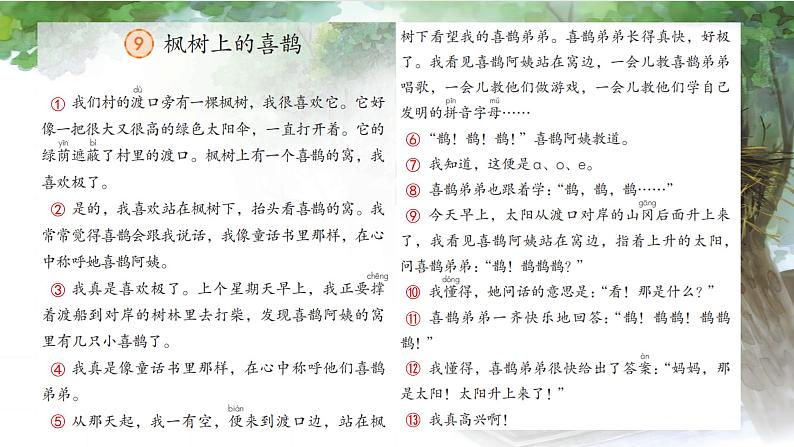 这是一份人教部编版9 枫树上的喜鹊评课ppt课件,共20页。PPT课件主要包含了自读课文,写字指导,第二课时等内容,欢迎下载使用。