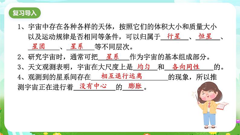 1、宇宙中存在各种各样的天体,按照它们的体积大小和质量大小以及运动规律是否相同等条件,可以归属于 、 、 、 等不同层次。2、研究宇宙时,通常可把 作为宇宙的基本组成部分。3、天文观测表明,宇宙在大尺度上是 和 的。4、观测到的星系间存在 的现象,所以推测宇宙正在进行着 的 。