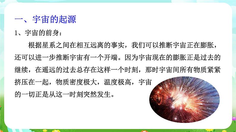 一、宇宙的起源 1、宇宙的前身: 根据星系之间在相互远离的事实,我们可以推断宇宙正在膨胀,还可以进一步推断宇宙有一个开端。因为宇宙现在的膨胀正是过去的继续,在遥远的过去总存在这样一个时刻,那时宇宙间所有物质紧紧挤压在一起,物质密度极大,温度极高,宇宙的一切正是从这一时刻突然发生。