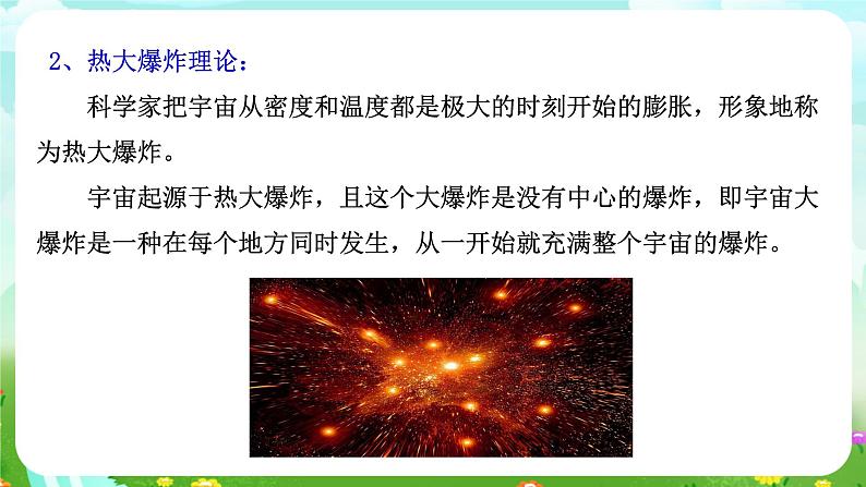 2、热大爆炸理论: 科学家把宇宙从密度和温度都是极大的时刻开始的膨胀,形象地称为热大爆炸。 宇宙起源于热大爆炸,且这个大爆炸是没有中心的爆炸,即宇宙大爆炸是一种在每个地方同时发生,从一开始就充满整个宇宙的爆炸。