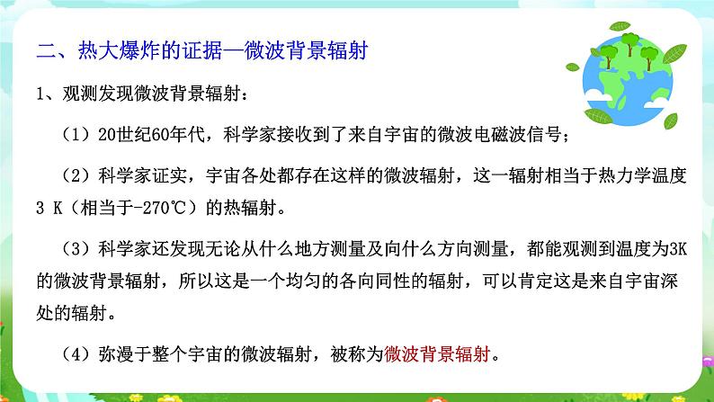 二、热大爆炸的证据—微波背景辐射1、观测发现微波背景辐射: (1)20世纪60年代,科学家接收到了来自宇宙的微波电磁波信号; (2)科学家证实,宇宙各处都存在这样的微波辐射,这一辐射相当于热力学温度3 K(相当于-270℃)的热辐射。 (3)科学家还发现无论从什么地方测量及向什么方向测量,都能观测到温度为3K的微波背景辐射,所以这是一个均匀的各向同性的辐射,可以肯定这是来自宇宙深处的辐射。 (4)弥漫于整个宇宙的微波辐射,被称为微波背景辐射。