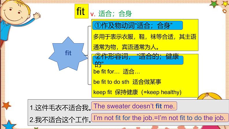be fit fr… 适合…be fit t d sth 适合做某事keep fit 保持健康(=keep healthy)