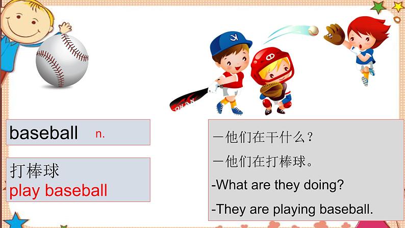 -他们在干什么?-他们在打棒球。-What are they ding?-They are playing baseball.