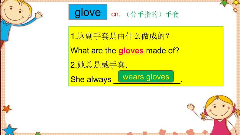 1.这副手套是由什么做成的?What are the glves made f?2.她总是戴手套.She always _______________.