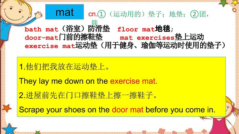 bath mat(浴室)防滑垫 flr mat地毯 ;dr-mat门前的擦鞋垫 mat exercises垫上运动 exercise mat运动垫(用于健身、瑜伽等运动时使用的垫子)