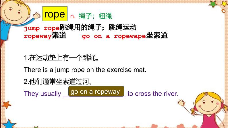 1.在运动垫上有一个跳绳。There is a jump rpe n the exercise mat.2.他们通常坐索道过河。They usually _________________ t crss the river.
