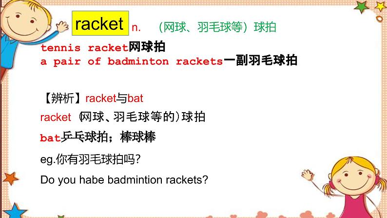 【辨析】racket与batracket(网球、羽毛球等的)球拍bat乒乓球拍;棒球棒eg.你有羽毛球拍吗?D yu habe badmintin rackets?