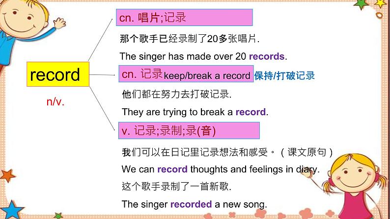 我们可以在日记里记录想法和感受。(课文原句)We can recrd thughts and feelings in diary.这个歌手录制了一首新歌.The singer recrded a new sng.