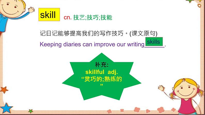 记日记能够提高我们的写作技巧。(课文原句)Keeping diaries can imprve ur writing______.