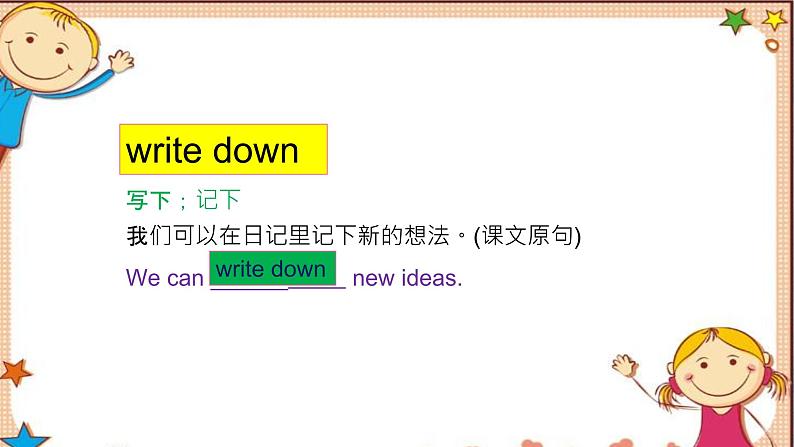 我们可以在日记里记下新的想法。(课文原句)We can ______ new ideas.