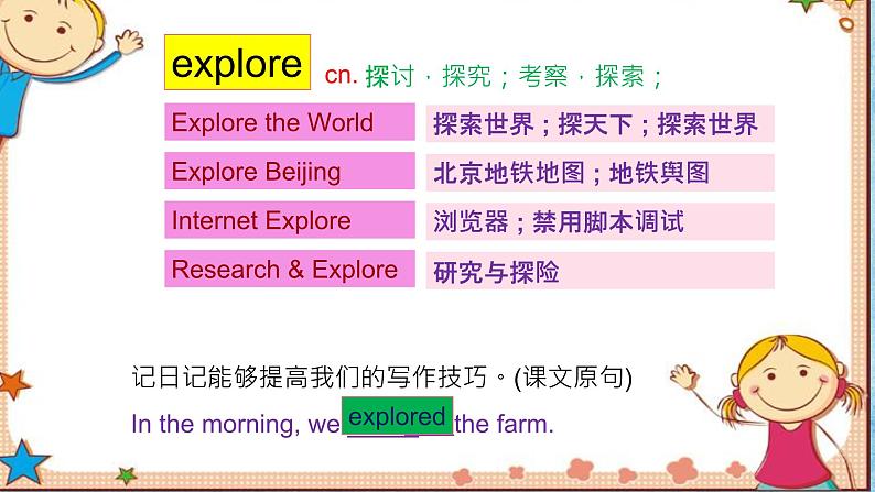 记日记能够提高我们的写作技巧。(课文原句)In the mrning, we _____ the farm.