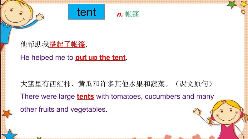 他帮助我搭起了帐篷.He helped me t put up the tent.大篷里有西红柿、黄瓜和许多其他水果和蔬菜。(课文原句)There were large tents with tmates, cucumbers and many ther fruits and vegetables.