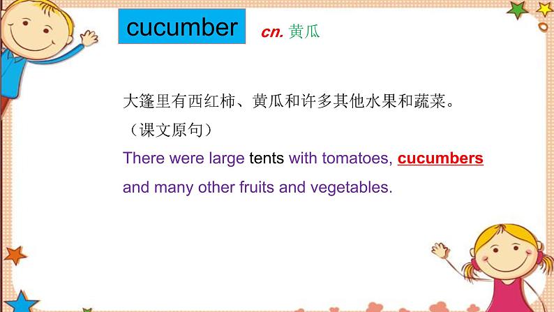 大篷里有西红柿、黄瓜和许多其他水果和蔬菜。(课文原句)There were large tents with tmates, cucumbers and many ther fruits and vegetables.