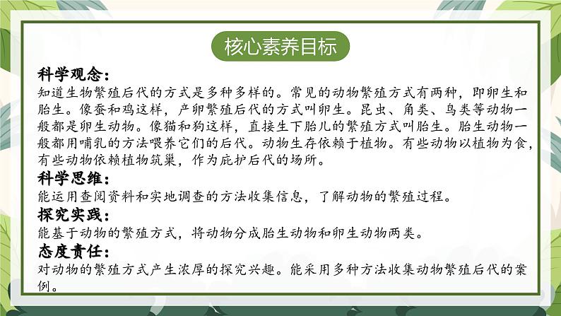 科学观念:知道生物繁殖后代的方式是多种多样的。常见的动物繁殖方式有两种,即卵生和胎生。像蚕和鸡这样,产卵繁殖后代的方式叫卵生。昆虫、角类、鸟类等动物一般都是卵生动物。像猫和狗这样,直接生下胎儿的繁殖方式叫胎生。胎生动物一般都用哺乳的方法喂养它们的后代。动物生存依赖于植物。有些动物以植物为食,有些动物依赖植物筑巢,作为庇护后代的场所。科学思维:能运用查阅资料和实地调查的方法收集信息,了解动物的繁殖过程。探究实践:能基于动物的繁殖方式,将动物分成胎生动物和卵生动物两类。态度责任:对动物的繁殖方式产生浓厚的探究兴趣。能采用多种方法收集动物繁殖后代的案例。