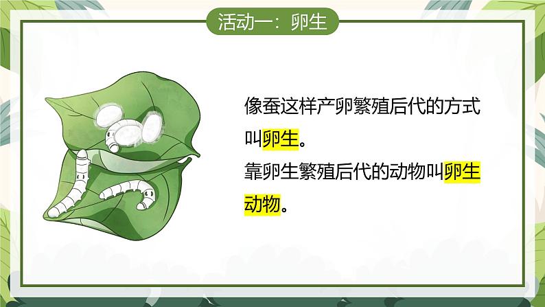 像蚕这样产卵繁殖后代的方式叫卵生。靠卵生繁殖后代的动物叫卵生动物。
