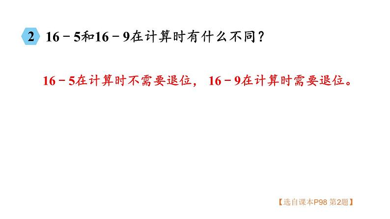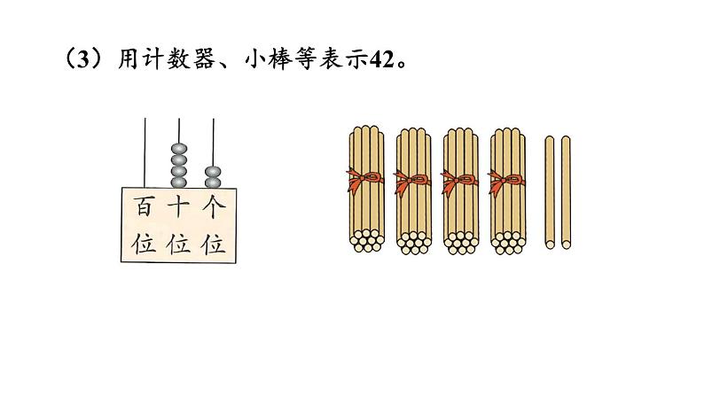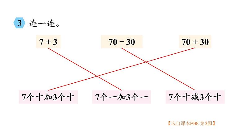 七 总复习西南版数学·一年级下册数与运算【选自课本P98 第1题】85(1)一个数个位上是4,十位上是7,这个数是( ),请在数线上标出来。(2)一个数比37大,比40小,这个数可能是( )或( )。【选自课本P98 第1题】74383974(3)用计数器、小棒等表示42。16 - 5和16 - 9在计算时有什么不同? 16 - 5在计算时不需要退位, 16 - 9在计算时需要退位。【选自课本P98 第2题】连一连。7 + 370 - 3070 + 307个十加3个十7个一加3个一7个十减3个十【选自课本P98 第3题】先观察图,再用竖式计算。352312142539【选自课本P98 第4题】1.填一填。(1)由8 个十和7 个一组成的数是( );100 里面有( )个十。(2)52的个位上的数是( ) ,表示( )个( );十位上的数是( ),表示( )个( )。(3)和69相邻的两个数是( )和( )。(4)一个两位数,个位上的数是3,十位上的数比个位上的数大2,这个两位数是( )。871022一55十687053【选自课本P100 练习十六 第1题】2.小云用5个○在数位表中摆出了一个数。你还有其他不同的摆法吗?试一试。○○○○○○○○○○○○○○○○○○○○【选自课本P101 练习十六 第2题】3.读一读计数器上的数,然后按要求完成下面各题。(1)第二个计数器上的数是由( )个十和( )个一组成的。78【选自课本P101 练习十六 第3题】807883.读一读计数器上的数,然后按要求完成下面各题。(2)在每个计数器的个位或十位上增加两颗珠子,哪个计数器上的数会变成100?先想一想,再说一说。第①个。8078843(答案不唯一)48434882【选自课本P101 练习十六 第4题】255.估一估。小明可能有多少元?(画“√”)小丽可能有多少元?(画“○”)○√【选自课本P102 练习十六 第5题】6.口算。20 + 40=6060 + 38=56 + 8=45 - 3=9 + 35=66 - 50=17 - 9=90 - 40=22 + 2=986442441685024【选自课本P102 练习十六 第6题】7.竖式计算。06381956【选自课本P102 练习十六 第7题】11118.看图填算式。425414【选自课本P102 练习十六 第8题】9.在○里填“>” “
