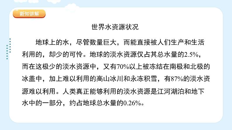 地球上的水,尽管数量巨大,而能直接被人们生产和生活利用的,却少的可怜。地球的淡水资源仅占其总水量的2.5%,而在这极少的淡水资源中,又有70%以上被冻结在南极和北极的冰盖中,加上难以利用的高山冰川和永冻积雪,有87%的淡水资源难以利用。人类真正能够利用的淡水资源是江河湖泊和地下水中的一部分,约占地球总水量的0.26%。