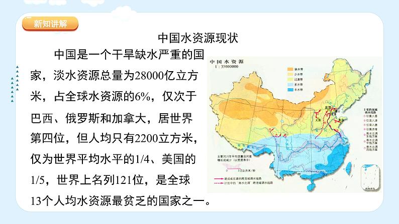 中国是一个干旱缺水严重的国家,淡水资源总量为28000亿立方米,占全球水资源的6%,仅次于巴西、俄罗斯和加拿大,居世界第四位,但人均只有2200立方米,仅为世界平均水平的1/4、美国的1/5,世界上名列121位,是全球13个人均水资源最贫乏的国家之一。