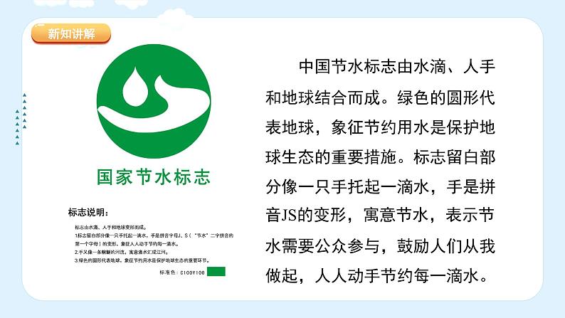 中国节水标志由水滴、人手和地球结合而成。绿色的圆形代表地球,象征节约用水是保护地球生态的重要措施。标志留白部分像一只手托起一滴水,手是拼音JS的变形,寓意节水,表示节水需要公众参与,鼓励人们从我做起,人人动手节约每一滴水。