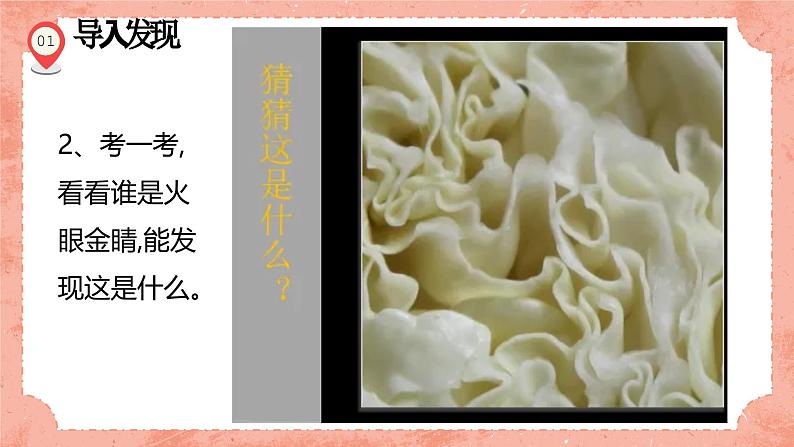 4、学习活动:挑选一种蔬菜或者水果,将其切开,看看里面是什么样子,把你的发现用流畅的线条画下来。5、除了切开的蔬果会有新发现,生活中有哪些有趣的视觉现象