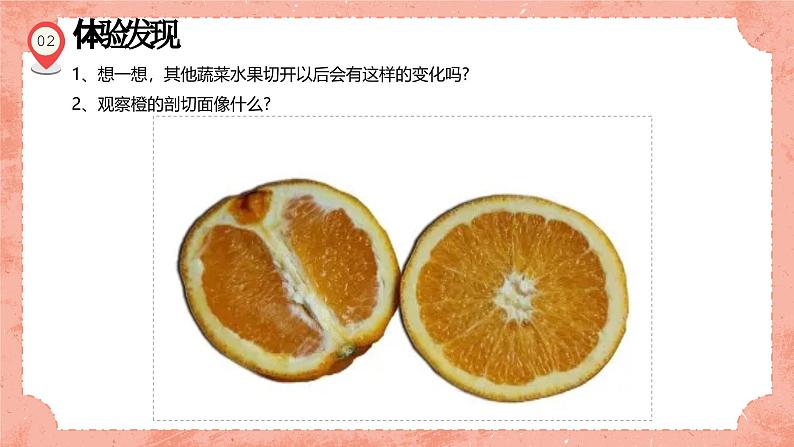 1、想一想,其他蔬菜水果切开以后会有这样的变化吗?2、观察橙的剖切面像什么?