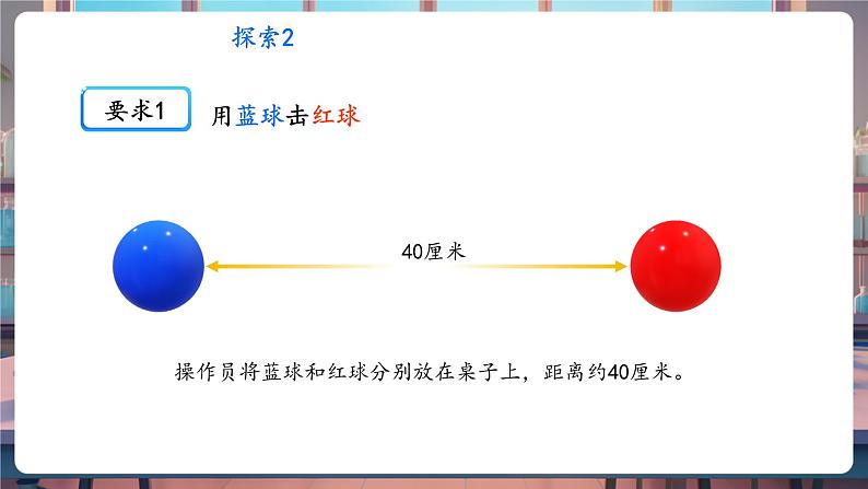操作员将蓝球和红球分别放在桌子上,距离约40厘米。