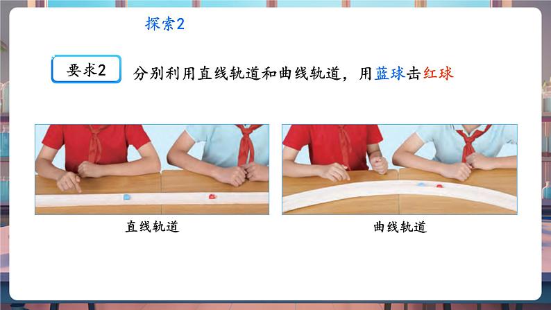 分别利用直线轨道和曲线轨道,用蓝球击红球