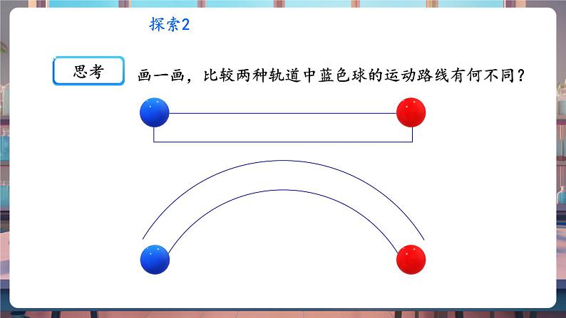 画一画,比较两种轨道中蓝色球的运动路线有何不同?