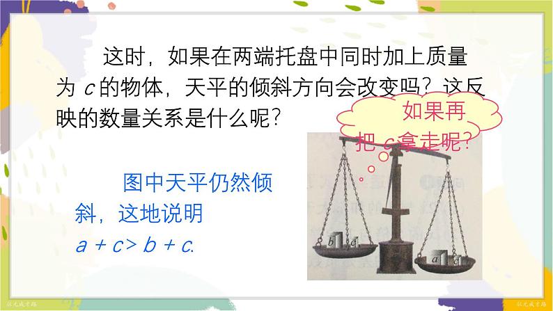 这时,如果在两端托盘中同时加上质量为 c 的物体,天平的倾斜方向会改变吗?这反映的数量关系是什么呢?