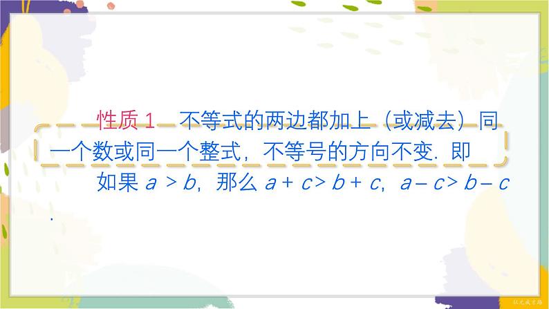 性质 1 不等式的两边都加上(或减去)同一个数或同一个整式,不等号的方向不变. 即 如果 a >b,那么 a + c>b + c,a – c>b – c .