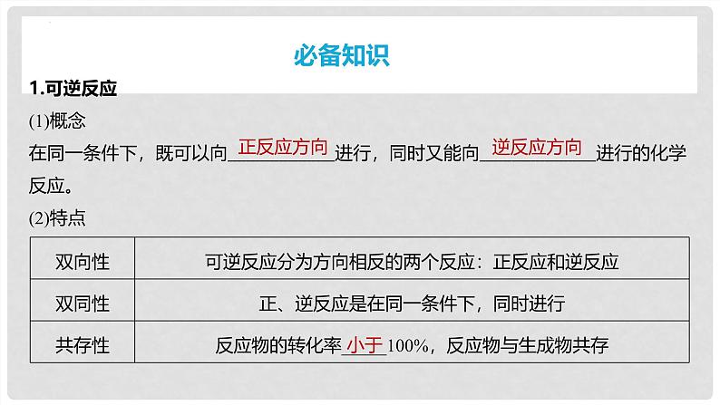 1.可逆反应(1)概念在同一条件下,既可以向 进行,同时又能向 进行的化学反应。(2)特点